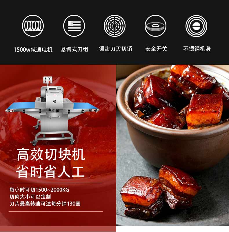 采用優質不銹鋼整體機身設計,強度高,無污染,符合食品安全生產規范 表面經過深度拋光和噴砂處理,外表光滑,易于清理 上刀下輥交叉配合,鋸齒刀刃切削,對肉類進行精密切割, 保證食材切面平整,品質如一。 安全開關,可有效地保護使用者的安全。 懸臂式刀組,可輕易拆卸、清洗,不同規格的刀組更換便捷。 工作效率高,產量大。 速度快,效率高。 1500W 減速電機電機,易啟動,扭矩大,切削輕快,更省電。 拆卸組裝容易,易于清理。 適用于各種禽肉類切條切塊。