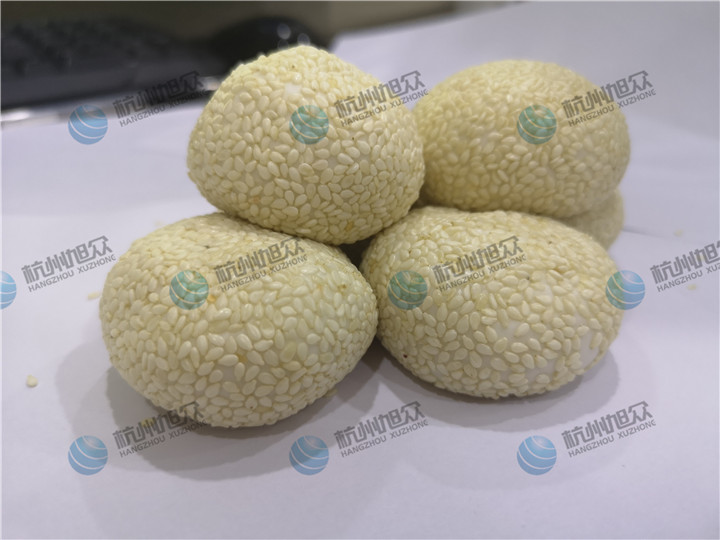 包餡機做出來的麻球就是這么一個光溜溜的麻球,克重大概48g左右,皮在46g,芝麻餡占非常小的比例,然后客戶還要裹白芝麻外衣,不可裹粉機目前沒有樣機,試不了于是采用了人工去給它們裹上白芝麻的效果如下圖: