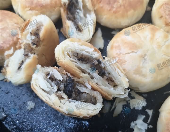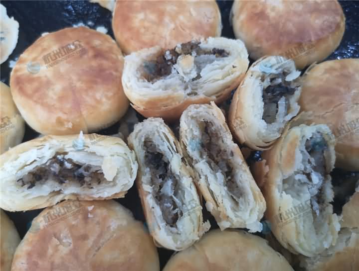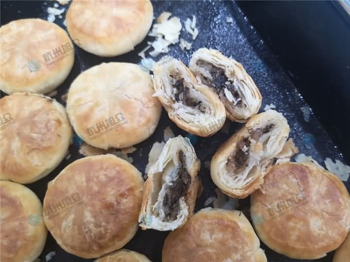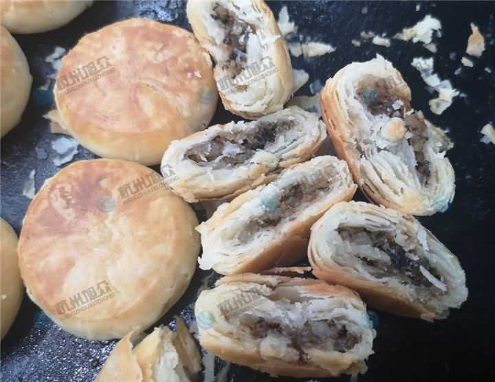 梅干菜酥餅層次分明,一咬就碎,酥酥脆脆的。梅干菜客戶的餡料,油面加入油酥搟成面皮,再通過酥餅機成型梅干菜酥餅,這個算半個旭眾酥餅工藝,也算半個客戶酥餅工藝,結合酥餅機做出來的酥餅效率高,外形大小美觀一致,旭眾酥餅機乃做酥餅的得力助手!