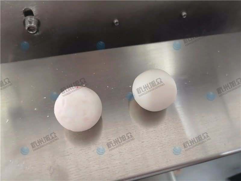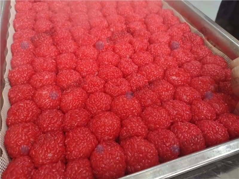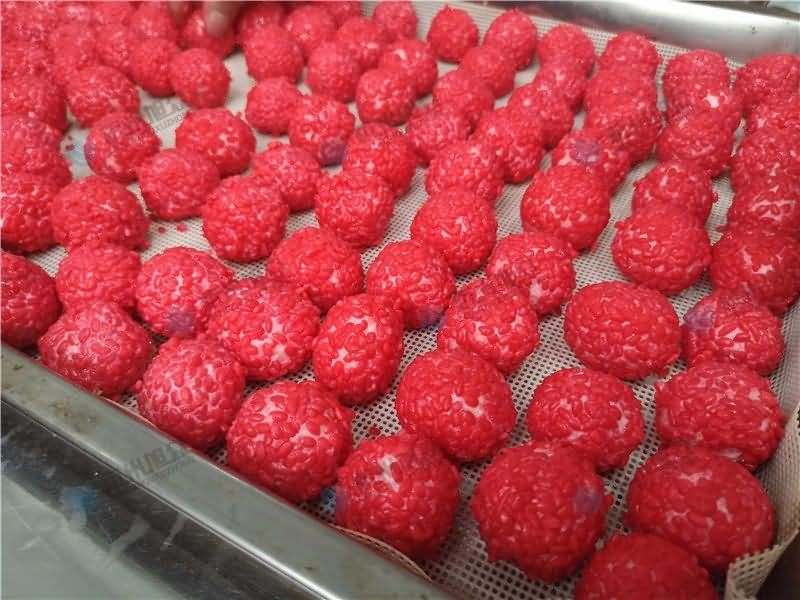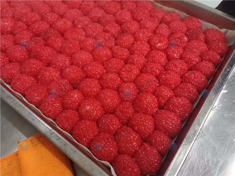 因為餡料、面皮都可是客戶自己準備帶來現場的,所以直奔主題,需要搓圓做成團子形狀,之后再人工裹紅米,因為不帶擺盤的VFD-4000A湯圓機當時沒有樣機,所以安排VFD-4000湯圓機(帶擺盤)做團子。