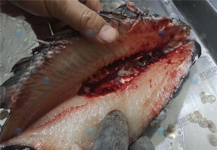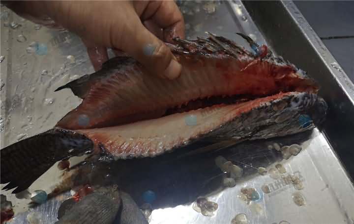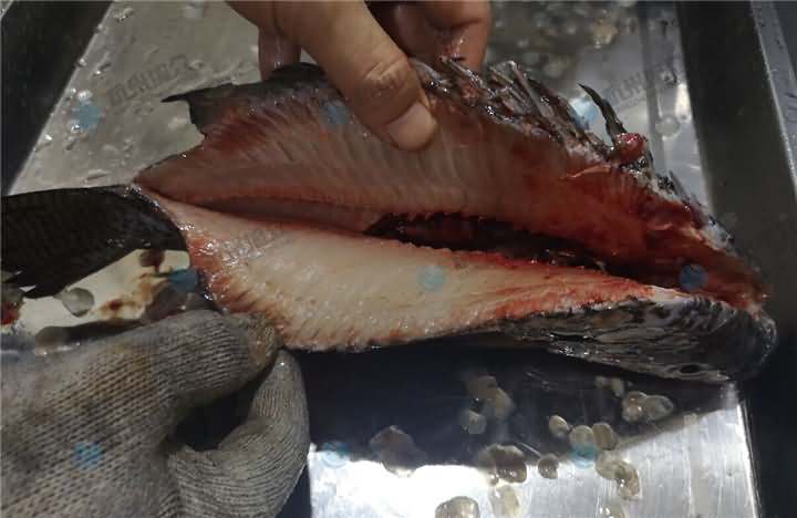 吃魚簡單,加工魚就有點復雜,人工加工一條羅非魚,先去鱗再開背或者開肚將內臟掏出,而旭眾全自動殺魚機只需要將羅非魚投入入口,便會自動給你去鱗開背或者開肚,因客戶開背要求于是便安排了XZ-017殺魚機對羅非魚進行開背去鱗加工,去鱗開背速度很快,刀口平滑,魚鱗也去的差不多,可能偶爾還是會有個別的魚鱗還沒有脫落,但是沒有關系,魚鱗本身就已經被打松了,只需人工用刀背帶一下就能脫落,那么我們先來看看殺魚機殺羅非魚的效果: