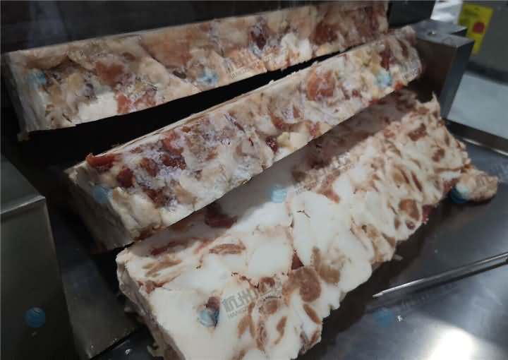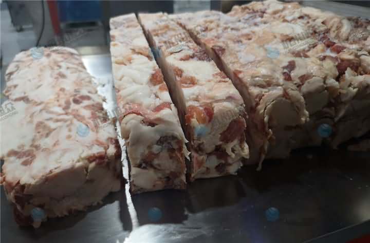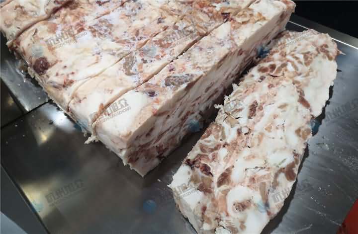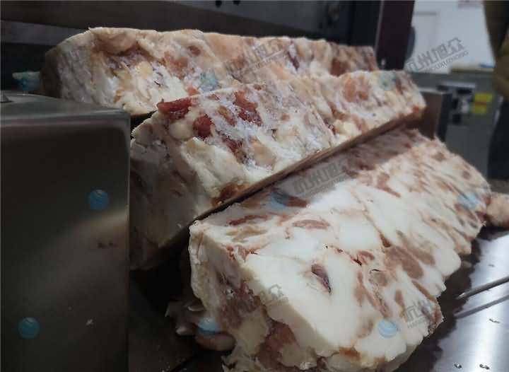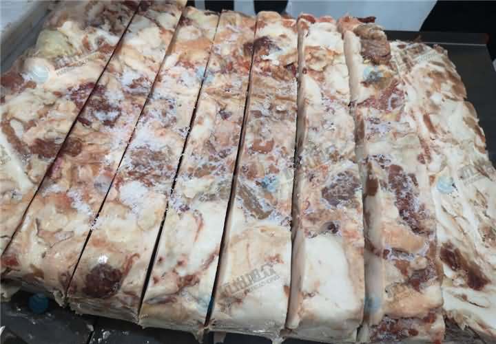 今日上門考察設備的客戶急忙從冷庫中帶了一大塊的凍肉過來,說應也不是特別硬,部分其實都有點化掉了,要求是機器將它切成長條塊就行了,后面切好的塊人工再加工下再放入絞肉機絞碎就行,客戶說主要凍肉人工去切這么一大塊太費勁了,于是根據(jù)他的要求推薦了牛羊肉切卷機,該機本身就是切凍肉,切片越薄肉卷就容易成卷,不過切的越厚就直接是塊了,該機切片厚度可調整,于是將它調制成5公分的厚度,那么我們來看看牛羊肉切卷機切凍肉塊效果: