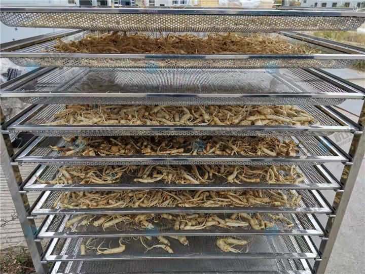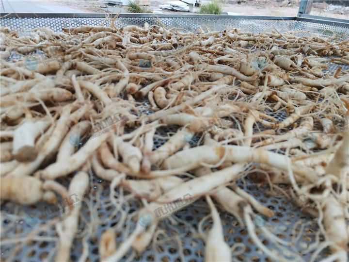 5、晾曬 洗刷凈的鮮參,按大、中、小分別單層擺放在烘干盤上。擺后送入室烘干。