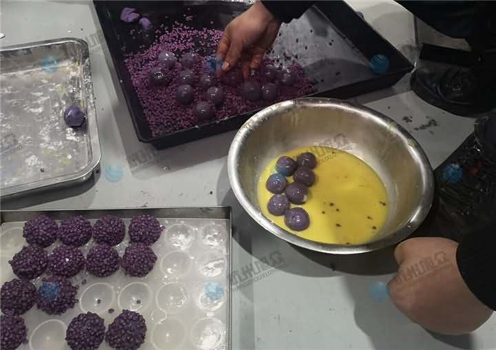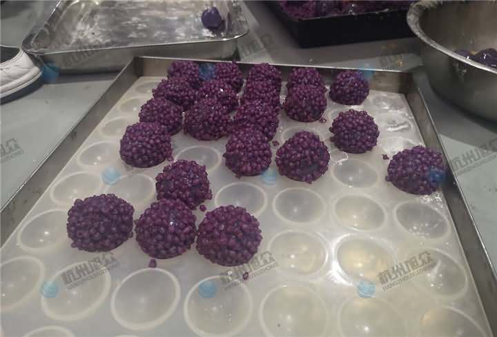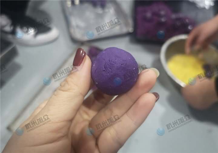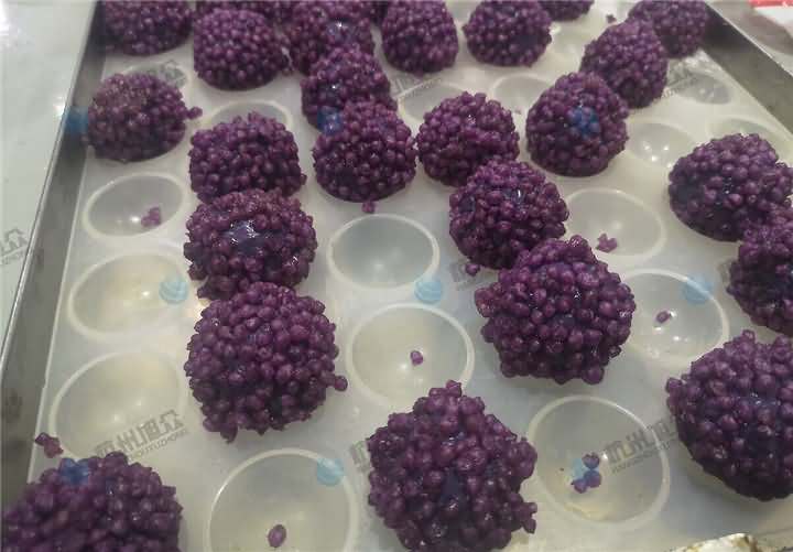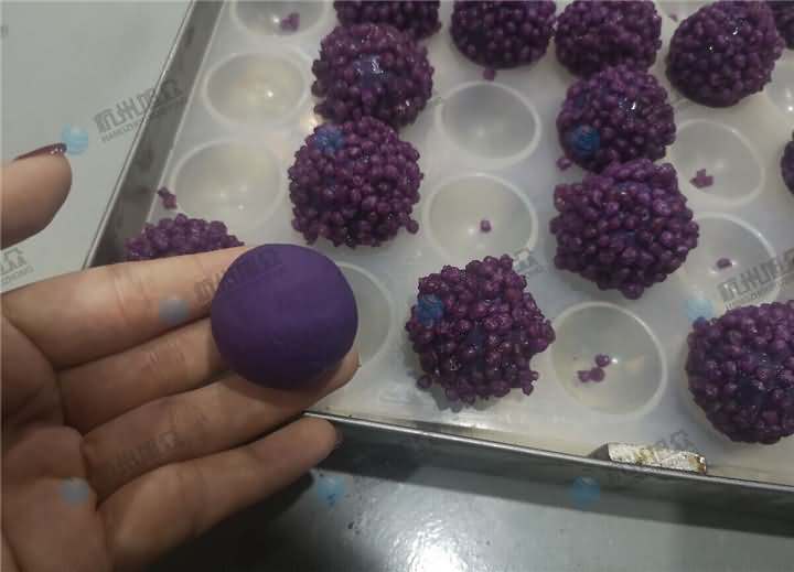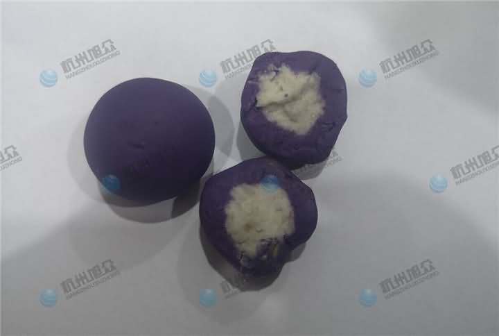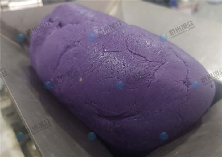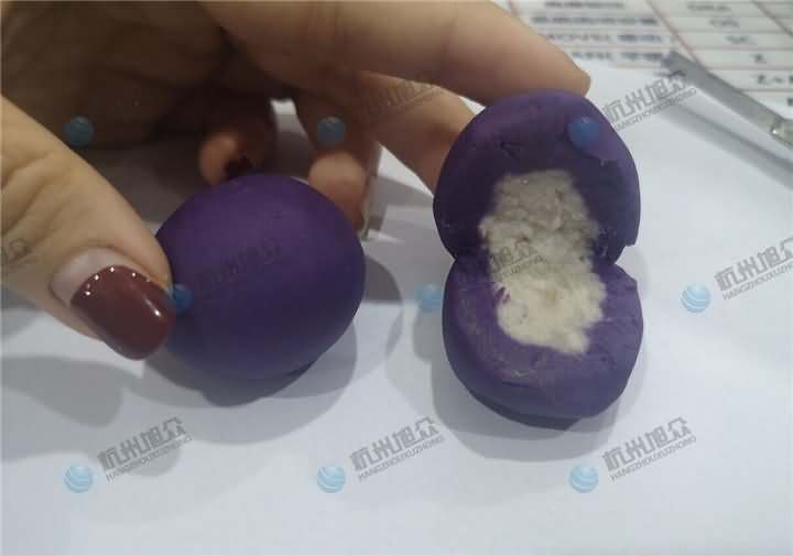 特色美食配送中心負責人帶著各種不同雜糧色彩的大米及紫薯面團、餡料來到杭州旭眾場地,這也是老客戶了,之前買的無餡糍粑機做糍粑用,這次想用機器加工紫薯球,發現之前買的無餡糍粑機不能成型,于是又來到現場想試湯圓機做紫薯球,因為現展廳湯圓機樣機只有VFD-4000湯圓機,于是便安排上用它來制作紫薯球,不過如果要購買的話還是推薦用VFD-4000A湯圓機不帶擺盤,因為客戶紫薯球外表還要裹蛋液和紫米、紅米等。全自動湯圓機制作紫薯球過程: