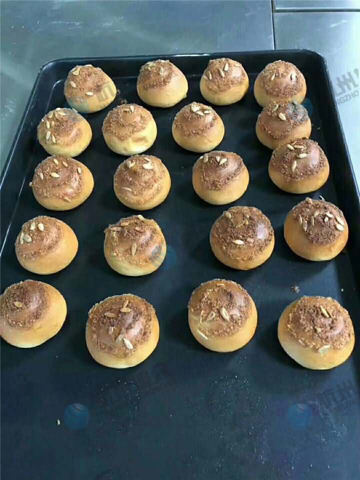 酥餅機做面包啦!當然并不是所有面包房里的面包都可以用酥餅機做哦!我們是根據客戶的物料及做法來推薦的設備,客戶提出只需要成型一個個圓形,后期添加花生等工藝人工自己弄弄便可,于是思來想去還是多功能酥餅機可以達到這個要求,客戶一聽說有機器可以做到便帶著自己的物料來到現場,至于是什么物料客戶具體沒有說我也不敢問,經由酥餅機做成面包坯,然后客戶再添加了些東西后,經過烤箱烘烤后面包房常見的面包就出來了!