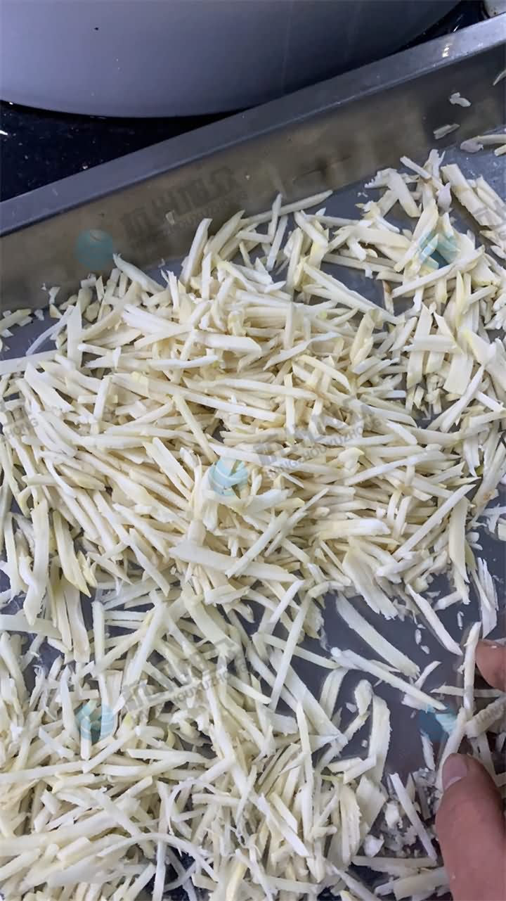 今天一大早就有客戶帶著竹筍來到現(xiàn)場,用多功能切菜機(jī)切筍絲效果: