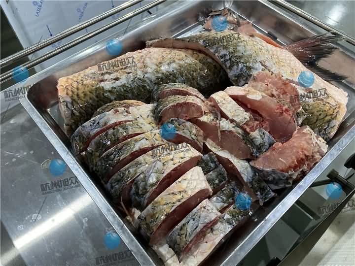 草魚剁塊選擇XZW-130禽肉類剁塊機,該剁塊機專業剁帶骨肉類食品,但除了大骨、豬蹄以外。禽肉類剁塊機分為丁刀組和單刀組,丁刀組剁的是方塊形,而單刀組則是直接塊,丁刀組對于物料要求高,需要物料冷凍后剁塊效果才明顯,就好比如雞架,如若直接將新鮮的雞架通過禽肉類剁塊機剁塊,那就會產生嚴重的連刀現象,一個刀不會直接切到釘板上,因為這樣釘板很容易報廢掉,二個就是雞皮本來就很有韌性,你讓人工去手撕雞皮也得費很大的勁,所以如果需要用丁刀組去剁雞塊、鴨塊的話物料要冷凍哦!而單刀組對于物料的要求就沒有那么高,醬板鴨、鹽水鴨、草魚剁塊用單刀組剁塊效果非常好,那么我們先來看看XZW-130禽肉類剁塊機剁草魚塊效果: