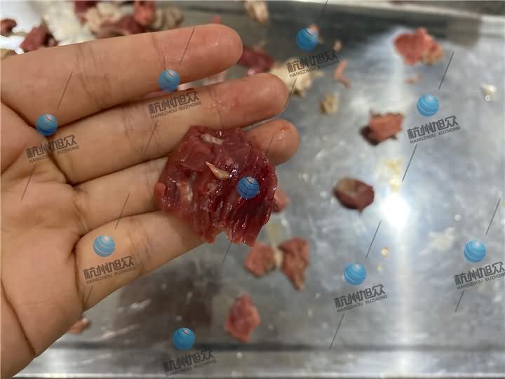 因為牛肉本身就不是特別的方正,所以也就不要期待切丁機切出來的牛肉丁每一顆都差不多大小,切出來的2cm的牛肉丁效果也是非常好,特別是牛筋也能切,客戶主要還是想看切丁機能否將帶有牛筋的牛肉切成丁狀。歡迎撥打4008852117咨詢客服了解更多關于XZ-QD切丁機設備!