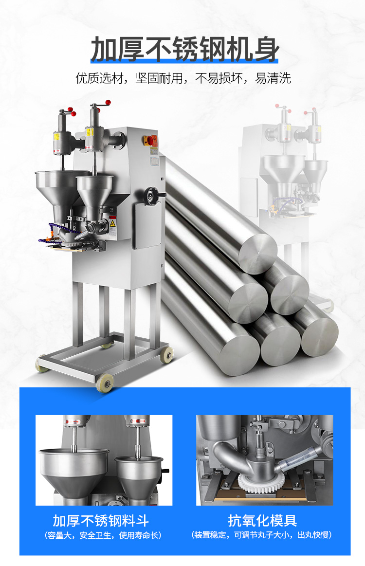 肉丸成型機為包餡肉制品成丸設備,能生產出各種大小尺寸的包餡魚丸、撒尿牛丸、豬肉丸、牛肉丸、及包餡貢丸等,并可做不包餡的各類丸子。該設備具有速度快、衛生方便、易拆洗等特點,可代替幾十個人手工生產,可為廠家節省人員的投入、提高生產速度。